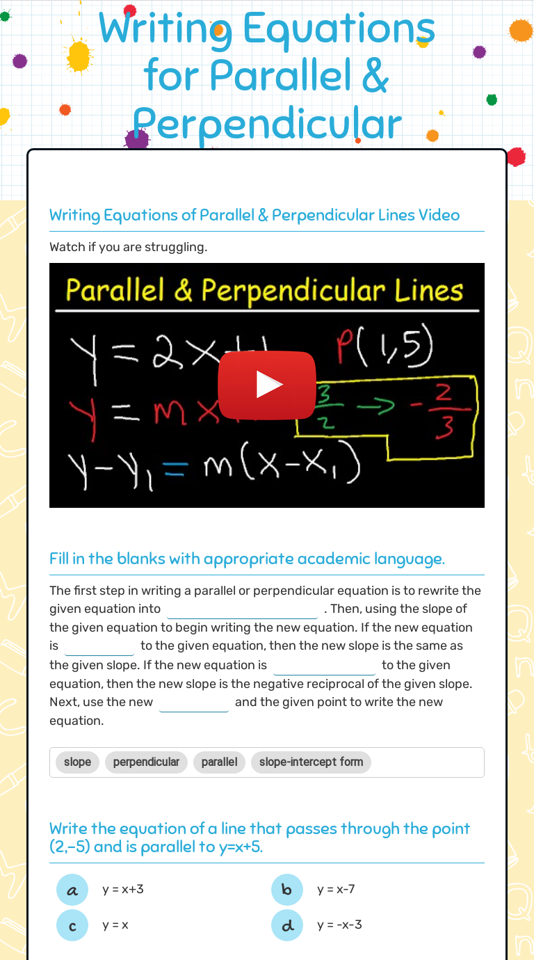 Slope intercept form of equation of a line worksheets from parallel and perpendicular lines worksheet, source:mathworksheets4kids.com. Answers to parallel & perpendicular slopes & equations of lines (id: Find the equation of each specified line. Worksheet phonic worksheets writing equations parallel and from parallel and perpendicular lines worksheet, source:cathhsli.org. So what we'll do is figure out the slope of a, then take the.